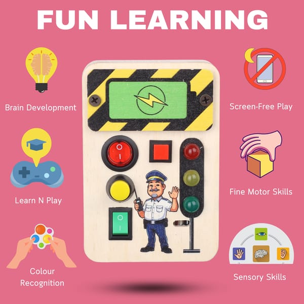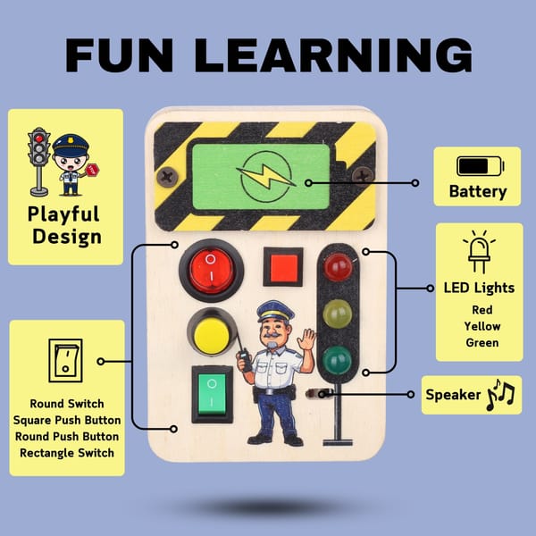 🚓 Sensory Toy for Independent Learning – The Police Car Busy Board features 6 interactive switches like horn button toggle switch key lock switch push button , 6 LED lights, and 1 switch for rhymes, creating an exciting and engaging experience. When kids press a button or flip a switch, the corresponding LED glows, and the rhyme switch adds a fun musical element. This encourages curiosity, hands-on exploration, and real-world problem-solving.